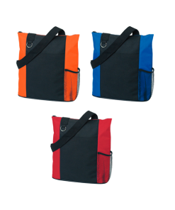Bolsa con cierre fabricada en poliéster 600 D (Tiene alta resistencia y capacidad de recuperación elástica, por lo que es resistente al desgaste, duradero, resistente a las arrugas y no se plancha), con bolsa lateral tipo red, correa para colgar en hombro y argolla metálica.