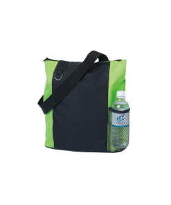 Bolsa con cierre fabricada en poliéster 600 D (Tiene alta resistencia y capacidad de recuperación elástica, por lo que es resistente al desgaste, duradero, resistente a las arrugas y no se plancha), con bolsa lateral tipo red, correa para colgar en hombro y argolla metálica.