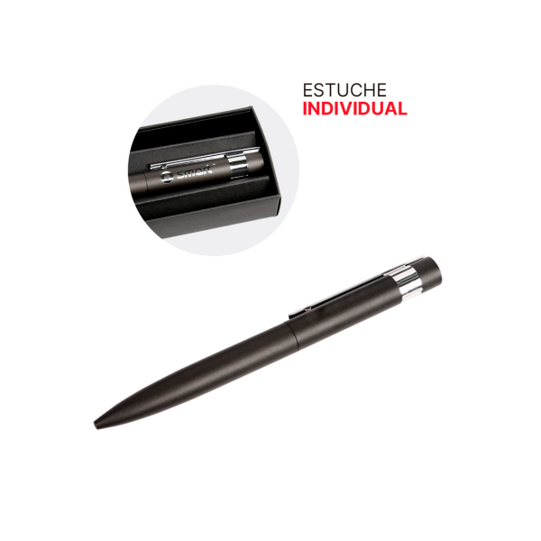 Bolígrafo twist fabricado en aluminio y clip cromado. Incluye estuche individual de cartón. Tinta de escritura negra.