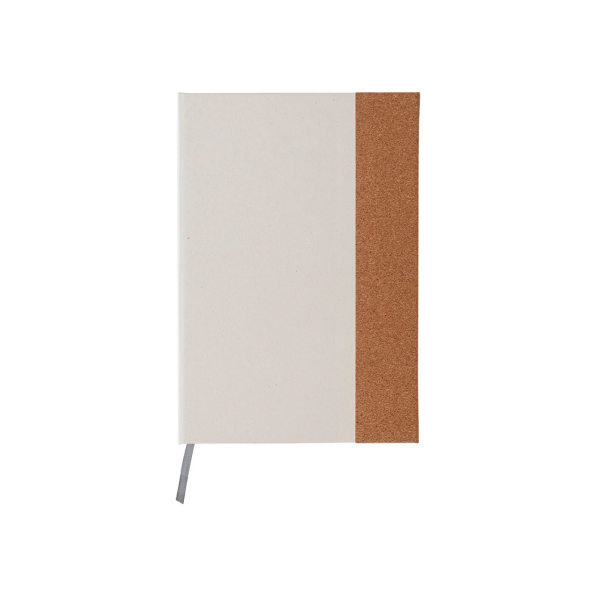 Libreta fabricada en milk paper (cartones reciclados de leche) y cartón, con pasta rígida, separador de hojas, detalle de corcho en la pasta y 80 hojas rayadas de 80 gr. Tamaño A5.