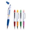 Bolígrafo de plástico, mecanismo retráctil, goma touch screen, limpiador de pantalla y soporte para celular.