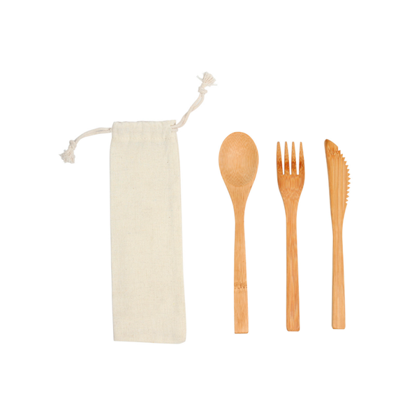 Set de cubiertos reutilizables fabricados en bambú, incluye cuchara, tenedor, cuchillo y bolsa de algodón con jareta.