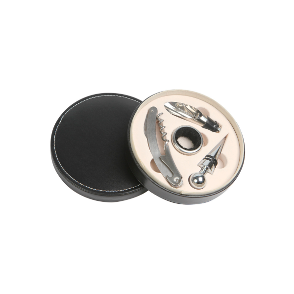 Set de vino redondo con accesorios metálicos, incluye: saca corcho, boquilla, corcho metálico y corta gotas.