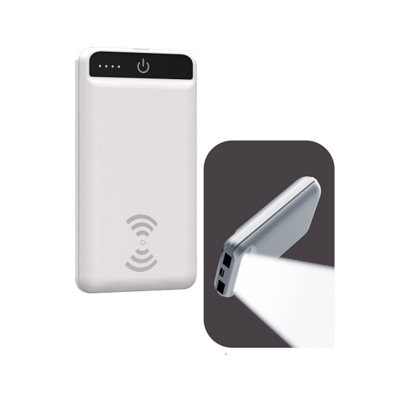 Power bank con wireless y 2 salidas, fabricada en ABS con capacidad de 8,000 mAh, con lámpara led.